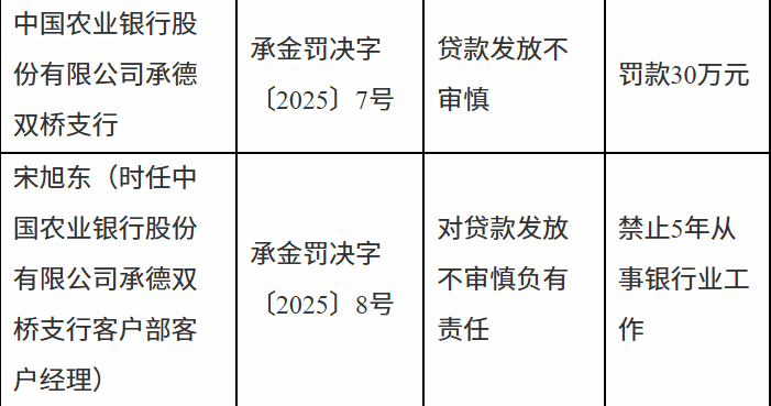 11月18日,国家金融监督管理总局承德监管分局行政处罚信息公开表显示配资论坛,中国农业银行股份有限公司承德双桥支行因贷款发放不审慎被罚款30万元;宋某东被禁止5年从事银行业工作。