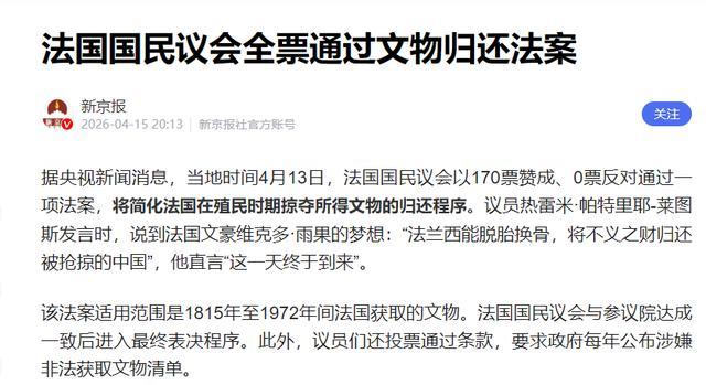 对我们而言,更该看清的是另一层对比,2009年,拍卖场上可以把圆明园兽首标上“估价2亿人民币”;2026年,法国议会却能“170:0”通过归还法案。