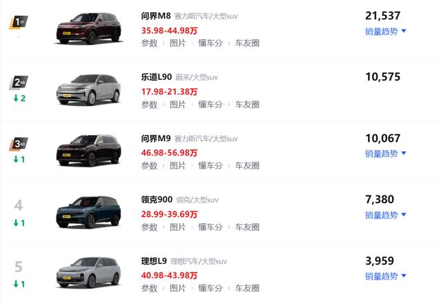 8 月销量数据显示,全尺寸 SUV 市场已清晰呈现出阶梯化竞争格局。根据终端上险量统计,问界 M8 以 21537 辆的成绩稳居榜首,成为 40 万级市场的绝对霸主,其销量几乎是第二名乐道 L90(10575 辆)的两倍。作为蔚来旗下重磅车型,乐道 L90 在首个完整交付月就跻身第二,展现了纯电车型在该细分市场的潜力。问界 M9 则以 10067 辆位列第三,这款车已连续 5 个月销量破万,同时还拿下 8 月插混保值率冠军。