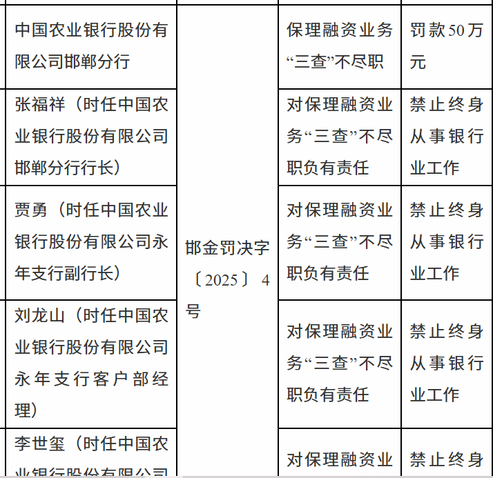 11月18日河南配资公司,国家金融监督管理总局邯郸监管分局行政处罚信息公开表显示,中国农业银行股份有限公司邯郸分行因保理融资业务“三查”不尽职被罚款50万元;张某祥、贾某、刘某山、李某玺被禁止终身从事银行业工作。